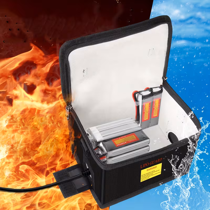 Praktisk batteriveske for lithium-batterier med skulderstropp og åpning for ledning. Perfekt for trygg oppbevaring og transport av dronebatterier og annet lithium-utstyr.