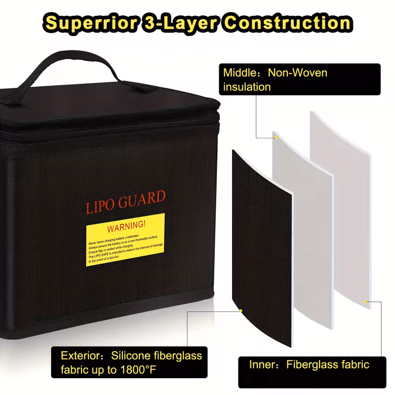 Denne vesken bidrar til tryggere oppbevaring og transport av lithium-batterier, men erstatter ikke ansvarlig bruk og korrekt batterihåndtering. Følg alltid produsentens anbefalinger for lading, lagring og transport av batterier.